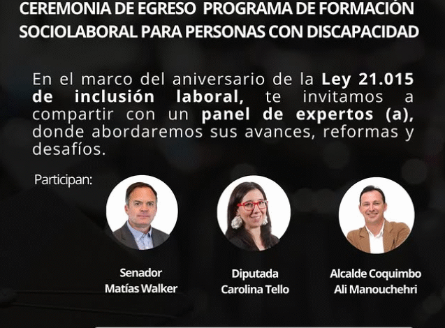 En el marco del aniversario de la Ley N° 21.015 de Inclusión Laboral, Fundación Ronda realizará este jueves 26 de junio un conversatorio con autoridades locales y representantes del sector público y privado. La actividad se llevará a cabo en el Salón Comedor del Edificio Consistorial de Coquimbo, y tiene como objetivo analizar los avances, desafíos y perspectivas de esta normativa, que promueve la incorporación de personas con discapacidad al mundo laboral.