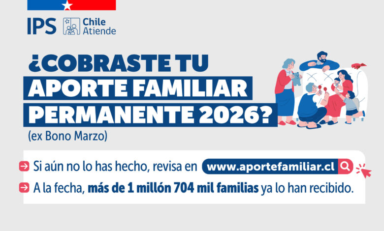 El Instituto de Previsión Social (IPS) realizó un positivo balance del pago del Aporte Familiar Permanente 2026 (ex Bono Marzo). Hasta la fecha, más de 1 millón 704 mil familias han recibido el beneficio, cuyo monto alcanza los $66.834 por carga familiar o por familia, según corresponda. De ellas, más de 28 mil son familias Atacameñas